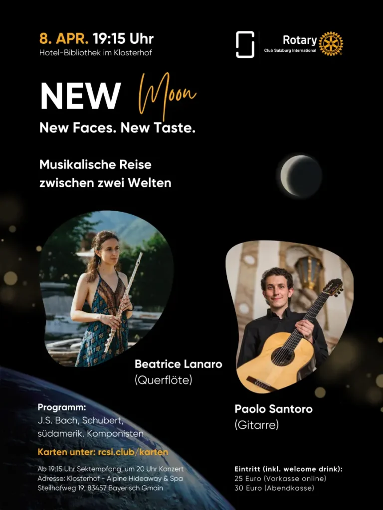 Die Konzertreihe „New moon. New faces. New taste.“ umfasst insgesamt drei Konzerte (13.11.23, 9.2.2024, 8.4.2024). Der Name der Serie symbolisiert, dass die Konzerte immer am Tag des Neumonds abgehalten werden. An diesem besonderen Abend werden neue talentierte Musiker aus verschiedenen Ländern, die in Österreich oder Deutschland leben, die Bühne betreten. Beim Sektempfang haben Sie die Gelegenheit, ein besonderes Getränk mit „New taste“ zu probieren.