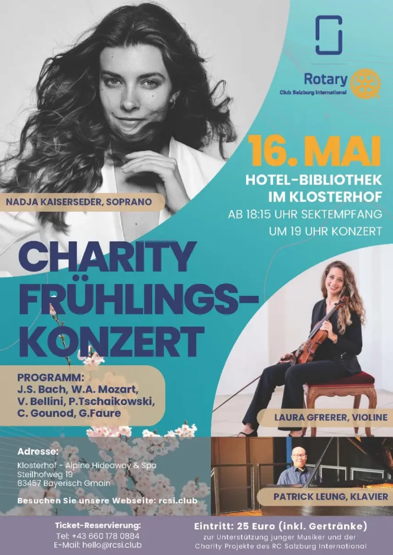 Der Rotary Club Salzburg International veranstaltet ein Charity Frühlingskonzert mit Laura Gfrerer (Violine), Nadja Kaiserseder (Sopran) und Patrick Leung (Klavier). Das Konzert findet am 16. Mai im Hotel-Bibliothek Klosterhof statt und beinhaltet Stücke von Bach, Mozart, Bellini, Tschaikowski, Gounod und Faure.